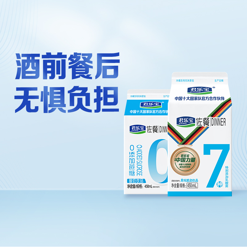酒前餐后 无惧腹担 【佐餐原味酸奶饮品 规格:1-15-450ml 保质期:120天】 生牛乳奶源,保持原奶醇香;7种乳酸菌发酵,关爱加倍,就餐、宴请推荐酸奶,以奶代酒,天长地久。 0蔗糖 轻负担 【佐餐0蔗糖酸奶饮品 规格:1-15-450ml 保质期:6个月】 0蔗糖,专为控糖人士专门打造的一款佐餐酸奶,并且保留了酸奶的醇香和柔顺的口感,同时采用7种益生菌发酵,健康餐桌从此开启。